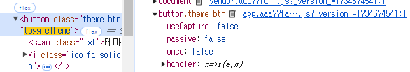 - 테마변경 버튼을 확인 -> @toggletheme을 실행한다는데 관련 코드를 확인할수 없었음